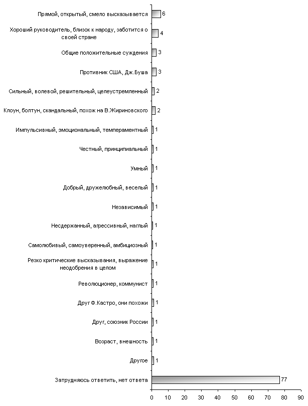 Как вы охарактеризуете Уго Чавеса? Что он за человек, какой он, на Ваш взгляд? (Открытый вопрос*. Задавался заявившим, что они видели Уго Чавеса по телевидению, читали о нем в прессе, слышали о нем по радио, - 30% от всех опрошенных.)
