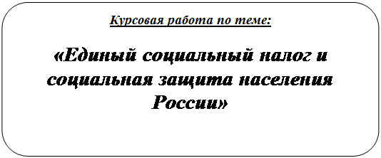 «Единый социальный налог и социальная защита населения России» - Содержание: 1.Вступление …стр.3 2.Налогоплательщики …стр.3 3.Объект налогообложения 3.1. Объект налогообложения для организаций и индивидуальных предпринимателей, производящих выплаты физическим лицам…стр.4 3.2. Объект налогообложения для индивидуального предпринимателя…стр.4 3.3.Объект налогообложения для физического лица …стр.4 3.4. Объект налогообложения для адвоката…стр.4 4.Налоговая база 4.1.Налоговая база для налогоплательщиков-организаций и индивидуальных предпринимателей, производящих выплаты физическим лицам…стр.4 4.2.Налоговая база для индивидуального предпринимателя …стр.5 4.3.Индивидуальные предприниматели - члены крестьянского хозяйства …стр.5 4.4. Налоговая база для физических лиц …стр.5 4.5.Налоговая база для адвоката…стр.5 5. Налоговый и отчетный периоды…стр.5 6.Суммы, не подлежащие налогообложению…стр.5 7.Налоговые льготы…стр.7 8.Ставки налога 8.1.Ставки налогов для лиц, производящих выплаты наемным работникам …стр.7 8.2. Ставки налога для организаций, занятых в производстве сельскохозяйственной продукции, родовые, семейные общины малочисленных народов Севера, занимающиеся традиционными отраслями хозяйствования, и крестьянские хозяйств…стр.8 8.3. Ставки налога для налогоплательщиков - индивидуальных предпринимателей…стр.8 8.4. Ставки налога для адвокатов…стр.8 9.Порядок исчисления налога.9.1.Порядок исчисления налога лицами, производящими выплаты физическим лицам…стр.9 9.2. Порядок исчисления и уплаты налога индивидуальным предпринимателем. ..стр.10 9.3.Порядок исчисления и уплаты налога адвокатом…стр.1010.Социальная защита населения. 10.1.Взносы в Пенсионный фонд РФ …стр.11 10.2..Взносы в Фонд социального страхования РФ (от несчастных случаев и профессиональных заболеваний)…стр.11 11. Основные социальные гарантии, предоставляемые государством населению РФ…стр.12 12.Заключение…стр.13 13.Расчетная часть курсовой работы…стр.14 14.Использованные документы…стр.16 1.Вступление. Единый социальный налог (далее ЕСН) предназначен для мобилизации средств для реализации права граждан на государственное пенсионное и социальное обеспечение и медицинскую помощь и зачисляется в федеральный бюджет и государственные внебюджетные фонды: Фонд социального страхования РФ и фонды обязательного медицинского страхования РФ. 1 января 2002 г. произошли существенные изменения в порядке исчисления и уплаты единого социального налога (ЕСН), что связано с проводимой реформой пенсионной системы и введением в действие Федерального закона от 15.12.2001 N 167-ФЗ "Об обязательном пенсионном страховании в Российской Федерации" (далее - Закон N 167-ФЗ). В результате был принят Федеральный закон от 31.12.2001 N 198-ФЗ "О внесении дополнений и изменений в Налоговый кодекс Российской Федерации и в некоторые законодательные акты Российской Федерации о налогах и сборах" (далее - Закон N 198-ФЗ). Сразу хочется обратить внимание на то, что с принятием вышеназванных Законов налогоплательщики наряду с уплатой ЕСН обязаны уплачивать страховые взносы на обязательное пенсионное страхование, которые поступают в бюджет Пенсионного фонда Российской Федерации (ПФР) и направляются на финансирование страховой и накопительной части трудовой пенсии(см.п.10.1.) При этом доля ЕСН, ранее зачисляемая в ПФР, поступает теперь в федера