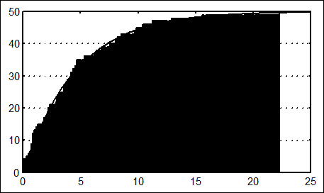 Рис.3. Функция эмпирического распределения Второй способ: упорядочим по возрастанию нашу выборку (см. Построение вариационного ряда ); образуем новую переменную F для значений функции: клавиша Var - Add - ... ( см. Генерация выборки ) - выделим новую переменную NEWVAR - правая клавиша мыши - Variable Specs ... - Name: F - Long name: = V0/50 (оператор V0 создает массив целых чисел) ; построим график: Graphs - Custom Graphs - 2D Graph - в новом окне установим: в поле X: x, в поле Y: F, Step Plot (ступеньки, но не Line Plot - линии) - OK . Наблюдаем функцию эмпирического распределения (с точностью до мелкого группирования с 250 интервалами). Группирование данных Analysis Frequency Tables - в окне Frequency Tables зададим No of exact intervals: 10 (10 интервалов группирования; или Step size: 2, starting at: 0 ), в поле Display options отметим Cumulative frequences ( накопленные частоты ), Percentages (проценты - относительные частоты), Cumulative Percentages (накопленные частоты ) - OK. Наблюдаем таблицу группированных данных. Выведем ее на печать или сохраним. Построение гистограммы частот Graphs - Stats 2D Graphs - Histograms - в появившемся окне устанавливаем: имя переменной, Graph Type: Regular, Fit Type; off ( без подбора ) или нужный тип, число интервалов группирования Categories: или Auto (автоматический выбор числа интервалов) - OK. Наблюдаем гистограмму (рис. 4). Отредактируем график, если необходимо. Выведем на печать или сохраним.