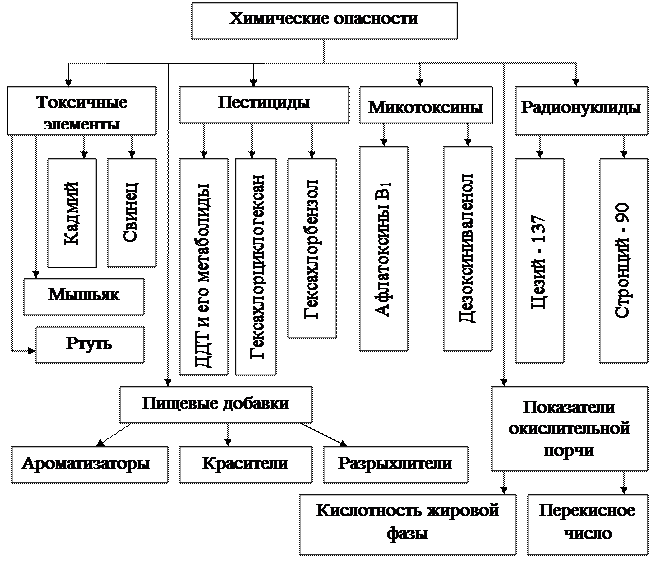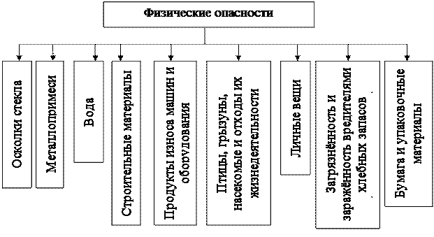 Рисунок 4 – Микробиологические опасности Для производства продукции, описанной в разделе 1.5, исходя из всей доступной информации, включая: - документы Минздрава и Госстандарта РФ; - ГОСТ Р 51705.1 - 2001 «Управление качеством пищевых продуктов на основе принципов ХАССП»; - СанПиН 2.3.2.1078-01 «Гигиенические требования безопасности пищевых продуктов и пищевой ценности»; - СанПиН 2.3.4.545-96 «Производство хлеба, хлебобулочных и кондитерских изделий»; - сообщения средств массовой информации; - материалы научно-технической литературы и периодических изданий; - информацию от потребителей (рекламации, благодарности); - информацию из центральной производственной, микробиологической и цеховых лабораторий; - информацию от контролирующих государственных органов (Госторгинспекция, ЦСМ); - НД и ТД на производство кондитерских изделий; Нами составлен перечень потенциально опасных факторов: физических микробиологических и химических, который приведен в таблицах 9,10 и 11 соответственно. Таблица 9 - Перечень физических опасных факторов