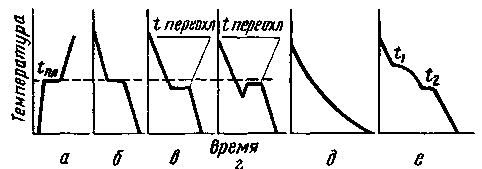 Рис. 2. Кривые нагревания и охлаждения чистого металла, аморфного тела и сплава а - кривая нагревания, б - кривая охлаждения без переохлаждения, в - кривая с переохлаждением, г - кривая с петлей переохлаждения, д - кривая охлаждения аморфного тела, е - кривая охлаждения сплава. В отличие от кристаллических тел аморфные не имеют выраженной границы при переходе из жидкого состояния в твердое (с понижением температуры процесс идет постепенно). Охлаждение и надевание сплавов характеризуются (в отличие от чистых металлов) тем, что затвердевание и расплавление у них происходит не при одной определенной температуре, а в интервале температур. Начало затвердевания сплава соответствует температуре t1 , а конец затвердевания — температуре t2 . Температуры, при которых происходят аллотропические и агрегатные превращения, называют критическими температурами или критическими точками. 4. СВОЙСТВА МЕТАЛЛОВ И МЕТОДЫ ИХ ИСПЫТАНИЙ Металлы характеризуются механическими, физическими, химическими и технологическими свойствами. Механические свойства — прочность, упругость, пластичность, твердость, и др. По ним определяют конструкционную прочность материала, технологическое поведение его при обработке, однородность и стандартность. Механические свойства определяют при проведении механических испытаний. Свойства зависят от химического состава, структуры и характера технологической обработки материала. Испытания бывают статические, когда прилагаемая нагрузка возрастает медленно и плавно; динамические, когда внешняя сила воздействует с большой скоростью (удар); технологические пробы, при проведении которых не принимается во внимание значение нагрузки, действующей на испытуемый образец. Испытание на растяжение является статическим. Его проводят для определения прочностных и пластических свойств металлов и сплавов. Прочность — способность металла не разрушаться под действием приложенных к нему внешних сил. Упругость — способность металла восстанавливать свою форму после снятия нагрузки, вызвавшей его деформацию. Пластичность — способность металла изменять под действием внешней силы свою форму и размеры, не разрушаясь, и сохранять полученную форму после прекращения действия силы. Характеристики механических свойств металла могут быть определены посредством диаграммы растяжения, которая показывает изменение длины образца в зависимости от приложенной к нему нагрузки (рис.3).