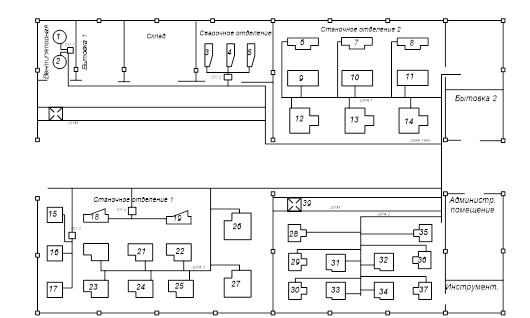 Суммарные расчетные активная и реактивная мощности цехов равны: РрΣ =27,52 МВт, QрΣ =12,19 МВ·Ар. 1.3 Выбор однолинейной схемы пункта приема электроэнергии и места его расположенияСхему ГПП выбирают с учетом установленной мощности потребителей электроэнергии и категории их надежности, характера электрических нагрузок и размещения их на генеральном плане предприятия, а также производственных, архитектурно-строительных и эксплуатационных требований. В общем случае схема ГПП включает в себя один или несколько понизительных трансформаторов и РУ высшего, среднего и низшего напряжений. Наиболее простыми и экономичными являются схемы подстанций без сборных шин на высшем напряжении. Такие схемы основаны на блочном принципе и рекомендуются к применению на все напряжения. Схемы с одной системой шин на первичном напряжении 110-220 кВ ГПП применяют при невозможности использовать блочные схемы без выключателей и без сборных шин. Схемы с двумя системами сборных шин на высшем напряжении применяют в редких случаях на очень мощных ответственных подстанциях, имеющих большое число присоединений, включая транзитные линии. Распределительные устройства с двумя системами шин дороги, сложны в эксплуатации и требуют сложных блокировок. Когда требуется гибкость оперативных переключений, а также частая ревизия выключателей по условиям их работы, применяют схемы с обходной системой шин. Схемы такого типа не являются характерными для промышленных предприятий, и их применяют на крупных узловых подстанциях районного назначения с большим числом присоединений. Для разработки экономически целесообразной системы электроснабжения необходимо ГПП установить в центре электрической нагрузки. Таблица 2 - Исходные данные для расчета ЦЭН