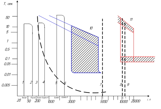 2.8 Построение карты селективностиКарта селективности строится в логарифмическом масштабе: по оси абсцисс откладываются токи - расчетные, пиковые и кз; по оси ординат - времена продолжительности пиковых токов и времена срабатывания защит по защитным характеристикам. Проверим выбранную коммутационную аппаратуру по условию селективности. Исходя из расчета токов КЗ.