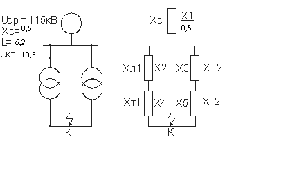 Сопротивление трансформатора: X4 = X5 = Xт = (Uк / 100) * (Sб / Sном.т. ); X4 = X5 = Xт = (10.5 / 100) * ( 700 / 2.5) = 29.4Ом.