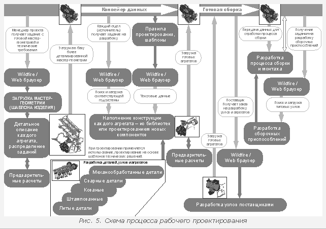 Для описания поведения детали, узла, конструктивного решения не требуется знания языков программирования или обширных познаний в области конечно-элементного анализа. Средства описания правил просты и легки в освоении. В системе Pro/ENGINEER реализован переход от типовых параметризованных элементов к элементам, управляемым инженерными критериями. В результате создается задел в виде централизованной базы шаблонов конструктивных решений и узлов, наделенных знанием о функциональном предназначении. Взятое из базы данных типовое решение подключается посредством команды Declare к таблице глобальных параметров (Layout ) текущего проекта и становится его частью, подчиняясь общей системе управления через глобальные параметры. Пройдя стадию эскизного проектирования, изделие (представляющее собой шаблон, состоящий из двумерной компоновки, трехмерной мастер-геометрии, а также стандартных элементов и решений) сохраняется в базе данных и переводится на стадию рабочего проектирования. Этап рабочего проектирования На рис. 3.5 представлена схема процесса рабочего проектирования. Суть процесса заключается в проектировании отдельных узлов и агрегатов. Отметим, что исходной информацией для данного этапа является мастер-геометрия изделия, полученная в ходе эскизного проектирования. На представленной схеме многие работы выполняются через обращение к механизму Wildfire/Web-browser , встроенному в Pro/E , начиная с версии Wildfire . Этот Web -навигатор является универсальным стандартным средством для поиска, просмотра и загрузки в Pro/ENGINEER любой интересующей информации. Он полезен во многих ситуациях - будь то получение задания на разработку, открытие папки в системе PDM , поиск типового компонента и так далее.