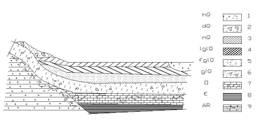 5. fglQ (флювиогляциальные отложения) - осадки, отложенные потоками талых ледниковых вод; представлены косослоистыми песками с валунами, галькой и гравием, супесями, реже суглинками.