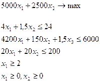 Задача 7Содержательная постановкаЛесничество имеет 24 га свободной земли под паром и заинтересовано извлечь из нее доход. Оно может выращивать саженцы быстрорастущего гибрида новогодней ели, которые достигают спелости за один год, или бычков, отведя часть земли под пастбище. Деревья выращиваются и продаются в партиях по 1000 штук. Требуется 1.5 га для выращивания одной партии деревьев и 4 га для вскармливания одного бычка. Лесничество может потратить только 200 ч. в год на свое побочное производство. Практика показывает, что требуется 20 ч. для культивации, подрезания, вырубки и пакетирования одной партии деревьев. Для ухода за одним бычком также требуется 20 ч. Лесничество имеет возможность израсходовать на эти цели 6 тыс. руб. Годовые издержки на одну партию деревьев выливаются в 150 руб. и 1,2 тыс. руб. на одного бычка. Уже заключен контракт на поставку 2 бычков. По сложившимся ценам, одна новогодняя ель принесет прибыль в 2,5 руб., один бычок - 5 тыс. руб. Математическая модельПредположим, что x1 - количество откармливаемых бычков в год;x2 - количество выращиваемых партий быстрорастущих новогодних елей по 1000 шт. каждая в год.