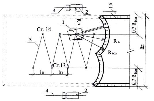 Уширенный торцевой забой экскаватора ОЛ: 1- экскаватор; 2- автосамосвал; 3- ось движения экскаватора; 4- ось движения автосамосвала