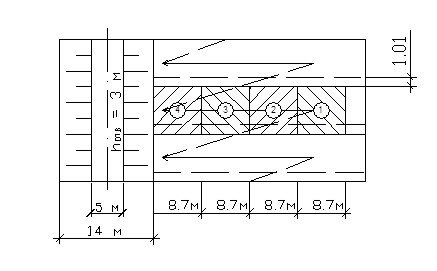6. Технология и схемы производства земляных работ 6.1 Схемы производства и перемещения грунта бульдозером Для наиболее полного сохранения растительного слоя грунта рекомендуется следующая технологическая схема и организация работ: 1) Строительная площадка делится на две захватки шириной по 100 м. 2) Два бульдозера разрабатывают и перемещают растительный грунт на середину захватки. В этом случае дальность перемещения не превышает 50м, поэтому бульдозеры разрабатывают и перемещают грунт без промежуточного вала. 3) После окончания снятия растительного слоя бульдозеры переходят на 2 захватку. Разработку грунта производим бульдозером типа ДЗ-8 на базе трактора Т-100. Для снятия растительного слоя разработку производим послойным способом. При послойном способе грунт разрабатывается слоями на толщину снимаемой стружки за один проход бульдозера последовательно по всей ширине выемки. Объем грунта, разрабатываемого и перемещаемого бульдозером, определяется по формуле: