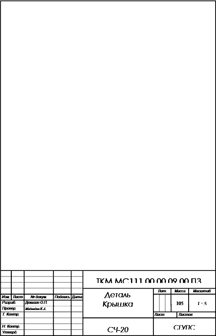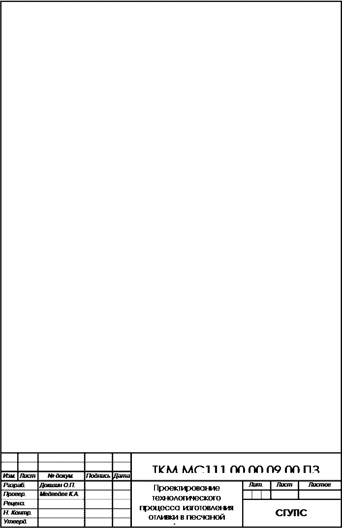 Сибирский государственный университет путей сообщения Кафедра «Технология транспортного машиностроения и эксплуатация машин» Проектирование технологического процесса изготовления отливки в песчаной форме. Расчетно-графическая работа по дисциплине «Технология конструкционных материалов» Пояснительная записка ТКМ МС-111.00.00.09.00 ПЗ Проверил: Доцент. К.А. Медведев __________ (подпись) _____________ (дата проверки) Разработал: Студент гр. MC-111 Докшин О.П. _________ (подпись) ______________ (дата сдачи на проверку) Краткая рецензия: ___________________________ (запись о допуске к защите) ________________________________ _____________________ (оценка по результатам защиты) (подпись преподавателя) 2010 г Содержание Введение..................................................................................................................................... 1. Технические требования к детали и ее чертежу........................................................... 2. Разработка чертежа отливки, назначение припусков на механическую обработку................................................................................................................................... 3. Разработка чертежа модели и стержня........................................................................... 4. Проектирование литниковой системы............................................................................ 5. Разработка разовой песчаной формы.............................................................................. 6. Выбор состава формовочной и стержневой смеси ..................................................... 7.Расчет режимов изготовления отливки........................................................................... Список литературы .................................................................................................................