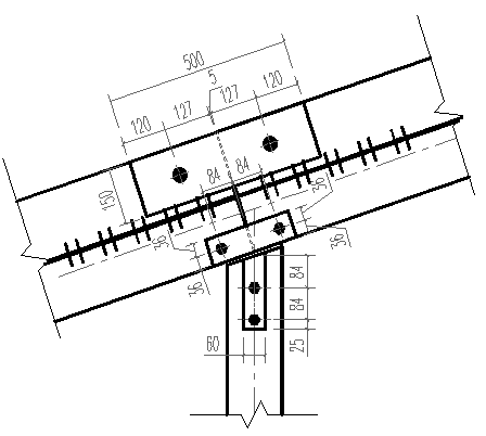 Рис. 7. Промежуточный узел фермы по верхнему поясу Расчет стержневых нагелей Предварительное значение диаметра стержневых нагелей: d=20 мм. Расчетная несущая способность на один срез нагеля при действия усилия под углом: aс =71.567 (ka =0.6): по условиям смятия: Тсм = 0.5 bn в ka = 0.5 ∙ 17.5 ∙ 2 ∙ 0.6 = 10.500kН; - по условия изгиба: Требуемое количество нагельных болтов (ns
