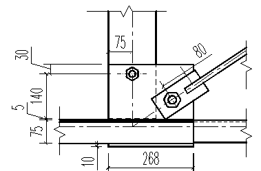 Рис. 8. Коньковый узел фермы Принята толщина фасонок: tф = 1 см. Ширина фасонок определяется из расчета на растяжение с учетом ослабления отверстием под центровой болт Æ26 мм: