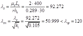 lo =139.15 см – геометрическая высота элементов 2-3, 5-6. imin =40.169 см – радиус инерции по меньшей стороне элемента. Коэффициент продольного изгиба: