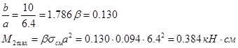 Максимальный изгибающий момент на единичную полосу торцевой диафрагмы, как пластинки, опертой по трем сторонам, с соотношением размеров bд /aд =4.000, при котором численный коэфициент b = 0.133: