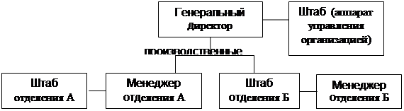 Рисунок 1.7. Линейно-штабная организационная структура управления Линейно-штабная структура — это линейная структура, дополненная специфическими подразделениями по подготовке управленческих решений. Эти подразделения не имеют нижестоящих уровней управления, они не принимают решений. Их задача — делать анализ вариантов и последствий решений для конкретного руководителя, к которому данное «штабное» подразделение прикреплено. Примерами подобных подразделений могут быть вычислительное бюро, юридическая служба, исследовательская группа [4]. К преимуществам линейно-штабной структуры можно отнести следующие: Линейные руководители освобождаются от нагрузки, что позволяет им качественнее осуществлять оперативное управление. Поскольку в штабные подразделения входят специалисты в конкретных областях, организация не нуждается в специалистах широкого профиля. Принимаемые решения носят более продуманный характер. Однако данный вид организационных структур имеет и ряд недостатков: У линейного руководителя сосредоточивается слишком много властных полномочий. Отсутствие четкой ответственности, поскольку специалист, подготавливающий решение, не занимается его реализацией; вследствие этого могут возникать проблемы, связанные с реализуемостью решений. Следующей разновидностью иерархического типа организации управления является дивизиональная структура (от англ, слова division — отделение), первые разработки которой относятся к 20-м годам, а пик практического использования — к 60-70-м годам нашего столетия (рисунок 1.8). Первыми перестройку структуры по этой модели начали крупнейшие организации, которые стремясь к разукрупнению, повышению гибкости и приспособляемости к изменениям во внешней среде, в рамках своих корпораций стали создавать производственные отделения, предоставив им определенную самостоятельность в осуществлении оперативной деятельности. В то же время администрация оставляла за собой право жесткого контроля по общекорпоративным вопросам стратегии развития, научно-исследовательских разработок, инвестиций и т. п. Поэтому этот тип структуры нередко характеризуют как сочетание централизованной координации с децентрализованным управлением.
