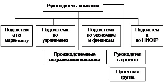 Рисунок 1.10. Проектная организационная структура управления Проектные управления применяются в организациях, занятых целенаправленными изменениями в действующей или создаваемой системе управления [Рисунок 1.10]. Как правило, такая система имеет несколько меняющихся целей, а процесс управления включает определение целей и функций, формирование организационной структуры, планирование и организацию выполнения работ, координацию действий исполнителей [15]. Формой реализации проектной структуры управления является создание специального подразделения, работающего в течение времени, необходимого для реализации определенной проблемы (проекта), например, освоение новых технологий обучения, модернизация производства, строительство объектов и т.п. В состав подразделения обычно включают необходимых специалистов, в том числе и по управлению. При такой форме управления руководитель проекта наделяется проектными полномочиями и несет ответственность за бизнес-планирование, расходование выделенных средств, материальную и моральную мотивацию работающих, а главное, разработку концепции управления проектом — приоритеты, распределение задач и ответственность за их выполнение. По завершении проекта структура распадается, а сотрудники переходят в новую проектную структуру или возвращаются на свою постоянную должность (при контрактной работе — увольняются) [16]. Проектный тип организационной структуры управления обладает большой гибкостью и универсальностью, простотой, экономичностью. Данный тип позволяет одновременно разрабатывать несколько проектов, но нередко это приводит к дроблению ресурсов и заметно усложняет поддержание и развитие производственного и научно-технического потенциала организации как единого целого [6]. При этом от руководителя проекта требуется не только управление всеми стадиями жизненного цикла проекта, но и учет места проекта в сети проектов данной организации. С целью облегчения задач координации в организациях создаются штабные органы управления из руководителей проектов или используются так называемые матричные структуры. Матричная организационная структура управления создается с помощью совмещения двух типов структур — линейно-функциональной и проектной (рисунок 1.11).