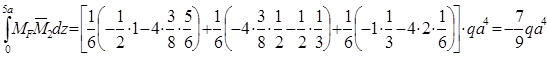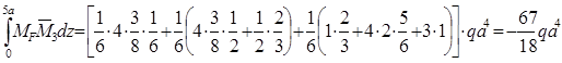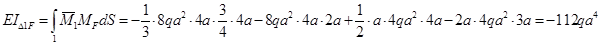 2.2.2.Энергетический метод Строим эпюры моментов от заданной нагрузки и от единичных воздействий, приложенных к балке в направлении искомых перемещений. Определяем моменты посередине участков. МсрDА = (МС + МА)/2 + qа2/8 = (0 + 1/2) qа2 + qа2/8 = 3/8 qа2, МсрАM = (МA + МM)/2 + qа2/8 = (0 + 1/2) qа2 + qа2/8 = 3/8 qа2, МсрME = (МM + МE)/2 + qа2/8 = (0 + 1/2) qа2 + qа2/8 = 3/8 qа2, МсрEB =(МE + МB)/2 = (1 + 3) qа2/2 =1/2 qа2, МсрBС =(МB + МC)/2 = (3 + 0) qа2/2 = 3/2qа2. Перемножая соответствующие эпюры, находим искомые перемещения, увеличенные для удобства вычислений в EI раз: