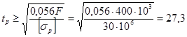 4.2 Определение размеров сечения Отрезки, отсекаемые нейтральной линией на осях координат ао= – iy2/xf = –4,33t 2/(4t) = –1,083t; bо= – ix2/yf = –10,67t 2/0 = ∞. Проводим нейтральную линию nn и устанавливаем опасные точки. Это будут точки 1 и 6 как наиболее удаленные от нейтральной оси. Из условия прочности на растяжение σmax = σmax = откуда Из условия прочности на сжатие σmin = σmin = откуда Следовательно, t = max 4.3 Построение эпюры нормальных напряжений. Исходя из принятых размеров сечения, находим напряжения в опасных точках