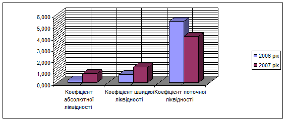З наведеної таблиці бачимо, що коефіцієнти абсолютної та швидкої ліквідності скоротилися, що пояснюється значним підвищенням короткострокових зобов’язань у 2007 році порівняно з попереднім. Коефіцієнт поточної ліквідності, навпаки, зріс, в перш за все, за рахунок значного скорочення дебіторської заборгованості. Зобразимо наглядно динаміку розрахованих трьох показників на рисунку 1.1.