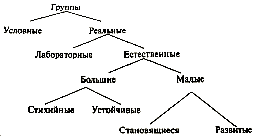 Рис. 1 Классификация групп, изучаемых в социальной психологии 2. Понятие коллектива, основные признаки и классификация коллективов. 2.1 Понятие коллектива и основные признаки. Психология и поведение отдельного человека как личности существенно зависят от социальной среды. Последняя представляет собой сложно устроенное общество, в котором люди объединены друг с другом в многочисленные, разнообразные, более или менее устойчивые соединения, называемые группами. Все естественные группы можно разделить на высокоразвитые и слаборазвитые . Слаборазвитые малые группы характеризуются тем, что в них нет достаточной психологической общности, налаженных деловых и личных взаимоотношений, сложившейся структуры взаимодействия, четкого распределения обязанностей, признанных лидеров, эффективной совместной работы. Вторые представляют собой социально-психологические общности, отвечающие всем перечисленным выше требованиям. Слаборазвитыми по определению являются, например, условные и лабораторные группы (последние часто лишь на первых этапах их функционирования). Среди высокоразвитых малых групп особо выделяются коллективы. Психология развитого коллектива характеризуется тем, что деятельность, ради которой он создан и которой на практике занимается, имеет, несомненно, положительное значение для очень многих людей, не только для членов данного коллектива. В коллективе межличностные отношения основаны на взаимном доверии людей, открытости, честности, порядочности, взаимном уважении и т.п. Для того чтобы назвать малую группу коллективом, она должна соответствовать ряду весьма высоких требований: успешно справляться с возложенными на нее задачами (быть эффективной в отношении основной для нее деятельности) , иметь высокую мораль, хорошие человеческие отношения, создавать для каждого своего члена возможность развития как личности, быть способной к творчеству, т.е. как группа давать людям больше, чем может дать сумма того же количества индивидов, работающих в отдельности. Психологически развитой как коллектив считается такая малая группа, в которой сложилась дифференцированная система различных деловых и личных взаимоотношений, строящихся на высокой нравственной основе. Такие отношения можно назвать коллективистскими. Коллективистские отношения определяются через понятия нравственности, ответственности, открытости, коллективизма, контактности, организованности, эффективности и информированности. Под нравственностью имеется в виду построение внутриколлективных и внеколлективных отношений на нормах и ценностях общечеловеческой морали. Ответственность трактуется как добровольное принятие коллективом на себя моральных и других обязательств перед обществом за судьбу каждого человека независимо от того, является он членом данного коллектива или нет. Ответственность также проявляется в том, что члены коллектива свои слова подтверждают делом, требовательны к себе и друг к другу, объективно оценивают свои успехи и неудачи, никогда не бросают начатое дело на полпути, сознательно подчиняются дисциплине, интересы других людей ставят не ниже своих собственных, по-хозяйски относятся к общественному добру. Под открытостью коллектива понимается способность устанавливать и поддерживать хорошие, строящиеся на коллектив