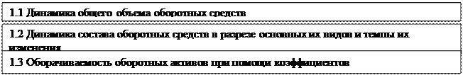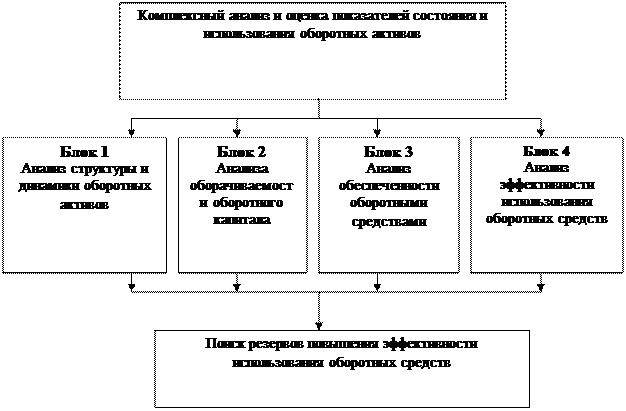 Рисунок 8 - Система комплексного экономического анализа и оценки состояния эффективности использования оборотных средств Блок 1 . Анализ структуры и динамики оборотных активов предприятия Горизонтальный анализ оборотных активов – это изучение и сравнение каждого показателя оборотных активов с предыдущим периодом с целью дать оценку абсолютным и относительным изменениям. Горизонтальный анализ основывается на трёх аналитических процедурах: - агрегирование показателей баланса в аналитический баланс и расчёт абсолютных величин укрупнённых статей. Например, нерасшифрованные статьи: материальные запасы, денежные средства, или вся дебиторская задолженность (долгосрочная и краткосрочная). - расчёт аналитических показателей по каждой укрупнённой или обычной статье: абсолютных и относительных изменений показателей, базисных и цепных темпов роста и прироста в зависимости от цели анализа. Абсолютные изменения показателей оборотных активов рассчитываются по следующей формуле: