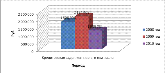 Рисунок 18 – Динамика кредиторской задолженности Увеличение доли собственного капитала в 1,5 раза связано, прежде всего, с ростом величины добавочного капитала (за 2008 год – 44,7%; за 2009 год – 40,3%; за 2010 год – 70,8%), то есть переоценки основных фондов. При этом наблюдается одновременное снижение чистой прибыли ООО Универмаг «Детский мир». В целом по вертикальному и горизонтальному анализу имущественного положения организации, можно сделать выводы, что за 2010 год у ООО «Универмаг детский мир» наблюдаются сдвиги в лучшую сторону. Уменьшение дебиторской и кредиторской задолженности, в том числе и просроченной, говорит о повышении уровня платежеспособности организации. Приведение запасов к нормативному уровню ведет к высвобождению денежных ресурсов, что укрепляет финансовую устойчивость предприятия. Неблагоприятным моментом является снижение прибыли организации, а значит и деловой активности. Пассив баланса характеризуется практически равными долями собственного капитала и краткосрочных обязательств, что также является положительным моментом, хотя и наблюдается довольно высокая степень финансовой зависимости предприятияООО Универмаг «Детский мир» от заемных средств. 2.3. Расчет и анализ эффективности управления оборотными активами. Эффективность использования оборотных средств имеет важное значение не только для данного предприятия, но и для народного хозяйства страны в целом. Благодаря более эффективному использованию оборотных средств высвобождаются не только денежные средства, инвестированные в производство, но и материальные ресурсы, в которые были вложены эти средства. Анализ эффективности использования собственного и заемного капитала организаций представляет собой способ накопления, трансформации и использования информации бухгалтерского учета и отчетности, имеющий целью: - оценить текущее и перспективное финансовое состояние организации, т.е. использование собственного и заемного капитала; - обосновать возможные и приемлемые темпы развития организации с позиции обеспечения их источниками финансирования; - выявить доступные источники средств, оценить рациональные способы их мобилизации; - спрогнозировать положение предприятия на рынке капиталов. Деловая активность характеризует эффективность текущей деятельности предприятия и связана с результативностью использования материальных, трудовых и финансовых ресурсов предприятия, а также с показателями оборачиваемости. Таблица 11 - Показатели оборачиваемости средств ООО Универмаг «Детский мир».