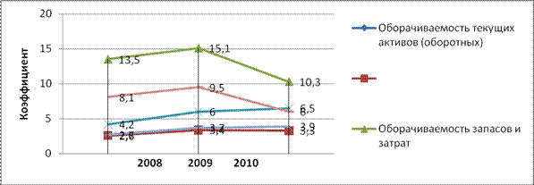 Оборачиваемость текущих оборотных активовООО Универмаг «Детский мир» согласно таблице 10 за 2010 год по сравнению с 2008 уменьшилась на 29 дней, но увеличилась по сравнению с 2009 годом и продолжительность прохождения оборотных активов стала составлять 110 дней.