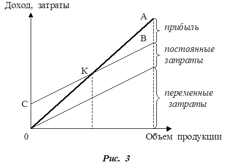 Проведем анализ безубыточности проекта. Для этого определим порог рентабельности, т. е. точку безубыточности производства. Порог рентабельности можно определить графически и аналитически. Графический метод. В прямоугольной системе координат строится график зависимости себестоимости и дохода от количества единиц выпускаемой продукции. По вертикали откладываются данные о себестоимости и доходе, по горизонтали – количество единиц продукции. Прямая ОА выражает получаемый доход, прямая СВ – затраты на производство. В точке критического объема К нет ни прибыли, ни убытка. Справа от точки К – область чистых прибылей, слева чистых убытков.