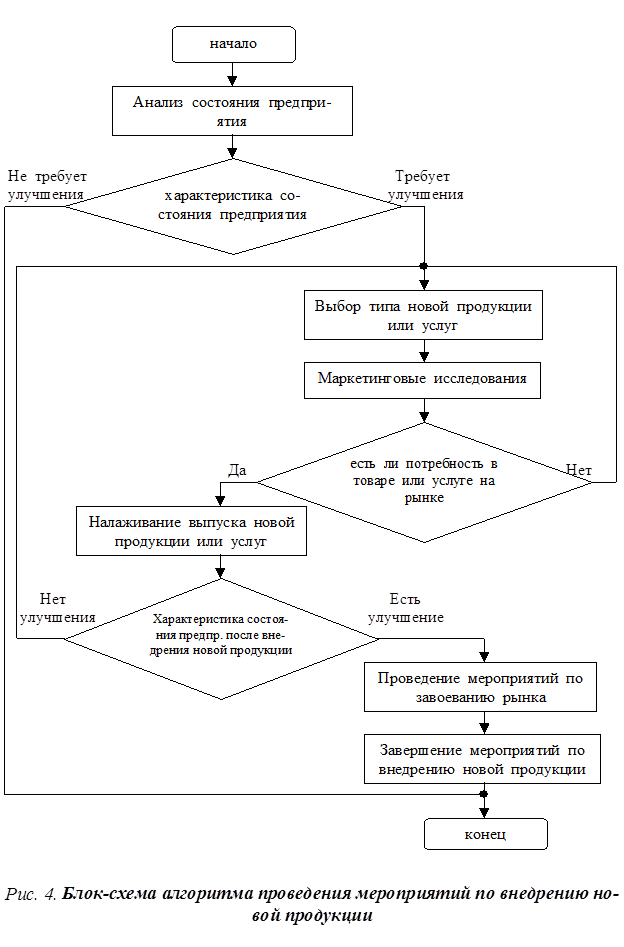 Чтобы определить критический объем выпуска продукции в денежном выражении, необходимо цену умножить на критический объем 4,50 ´ 136000 = 612 тыс. руб. Следовательно, при объеме реализации продукции в сумме 612 тыс. руб. не будет ни прибылей, ни убытков. В нашем случае запланированный объем продукции в денежном выражении равен 4,5 что превышает критический объем выпуска более чем в 2 раза. 2.5. Экономические результаты внедрения мероприятияПо результатам внедрения новой продукции можно сделать следующие выводы: -расширяется активность предприятия, которое использует собственные накопления не только для поддержания и развития основного бизнеса, но и направления их на освоение нового вида продукции, создание нового производства. Объем выпуска новой продукции (макаронных изделий) в 2000 г. составит 684 тыс. руб., а в 2001 г. – 1423 тыс. руб.; -увеличивается объем товарной продукции. Так, в 2000 г. планируется, что с учетом динамики выпуска традиционной и выпуска внедренной продукции объем товарной продукции достигнет 7124 тыс. руб., а в 2001 г. – 8897 тыс. руб. (см. приложение рис. 7); -существенно увеличится прибыль предприятия. Так, в 2000 г. с учетом динамики выпуска традиционной и выпуска внедренной продукции планируется величина валовой прибыли 599 тыс. руб., балансовой прибыли – 522 тыс. руб. В 2001 г. валовая прибыль составит 833 тыс. руб., а балансовая – 702 тыс. руб. (см. приложение рис. 8); -рентабельность предприятия составит в 2000 г. 8,4 %, в 9,4 %(см. приложение рис. 9); Кроме этого также необходимо учесть социальный фактор – на предприятии увеличивается количество рабочих мест, что способствует уменьшению количества безработных и выполнению Федеральной целевой программы содействия трудовой занятости осужденных к лишению свободы. Доля макаронной продукции в общем объеме выпуска достаточно велика (см. приложение рис. 2). Если считать, что основной вид деятельности предприятия Учреждения УО 68/4 производство непродовольственных товаров, то окажется что доля неосновных товаров (хлеба и макаронных изделий) в общем объеме выпуска составляет 52 %. Г лава 3. Специальный разделУкрупненная блок-схема алгоритма решения на ЭВМ задачи освоения на предприятии новых видов продукции Описание работы алгоритма (см. блок-схему рис.4): 1. Производится анализ состояния предприятия, определяются основные экономические показатели деятельности предприятия. 2. Производится анализ показателей, и на его основе делается характеристика состояния предприятия. Эта характеристика оценивается на предмет, требует ли состояние предприятия улучшения или нет. 3. Если улучшения не требуется, то работа ЭВМ заканчивается – переход к п. 11. 4. Если улучшение требуется, то производится выбор новой продукции или услуг, которые может изготавливать (выполнять) предприятие. 5. Выполняются маркетинговые исследования, 6. Определяется потребность в товаре (услуге), если потребности в товаре (услуге) нет, то производится нового товара (переход к п. 4). 7. Если потребность в товаре есть, то производится налаживание выпуска новой продукции или услуги, обычно небольшой пробной партии. 8. Производится характеристика состояния предприятия после внедрения новой продукции или услуги. Выявляется, произошло ли улучшение состояния предприятия после внедрения или нет. Если нет, то производится выбор новой продукции или услуги (перехо