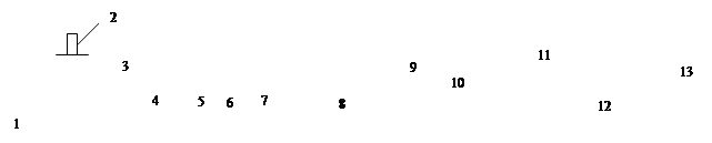 Рис.1. Схема экструзионной линии производства полиэтиленовых труб: 1- промежуточная емкость; 2- сушилка; 3-загрузочный бункер; 4- экструдер; 5 – экспрузионная головка; 6 – калибр; 7- вакуумная ванна охлаждения; 8- ванны охлаждения (2 шт); 9- устройство маркирующее, 12- приемное устройство; 13- намоточное устройство Характеристика основного оборудования приведена в таблице 7 Таблица 7