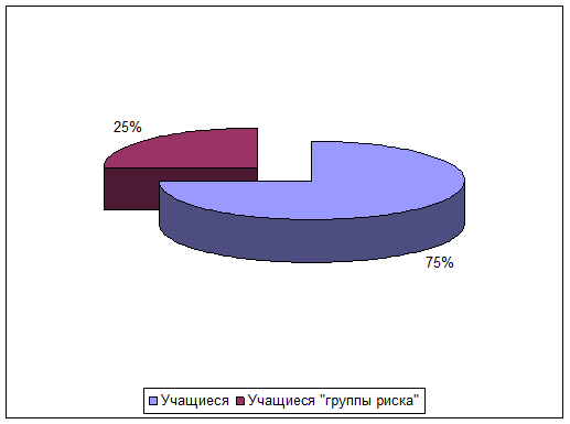 Рис. 3.1. Структура учащихся В ходе исследования социальной работы с подростками «группы риска» данного учебного учреждения, было проведено интервью с педагогом-психологом Евсеевой Натальей Александровной. По ее словам, в училище налажена работа социальных педагогов и психологов с рассматриваемой категорией учащихся. В процессе социальной работы выявляются вопросы организации индивидуальной воспитательной работы с подростками, склонными к употреблению алкоголя, наркотических средств и токсикоманами. На основании данных, полученных в ходе интервью, видно следующее: учащиеся поделены на определенные группы, в зависимости от их наклонений. Так, например, при рассмотрении подростков «группы риска», склонных к алкоголю, следует исходить из реального положения дел и учитывать тот факт, что к 17 годам подавляющее большинство молодых людей получает опыт употребления алкоголя. Строиться работа с данной группой уже с учетом этого печального факта. Отбор в «группу риска» подростков, склонных к наркомании, проводятся с особой тщательностью. Педагоги при таком отборе проявляют особое «психологическое чутье». Задача отбора в эту «группу риска» - не допустить даже единичного употребления наркотика. Она диктуется особой опасностью и легкостью возникновения зависимости от наркотика. На рис. 3.2. представлено соотношение подростков «группы риска» по их направленности в поведении.