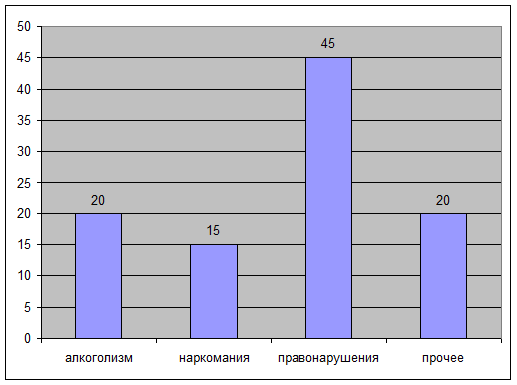 Рис. 3.2. Удельный вес учащихся отклоняющегося поведения Из рисунка 3.2. следует, что правонарушения имеют больший удельный вес среди детей «группы риска» 45%, подростки, которые имеют наклонности к наркомании, составляют 15 %, подростки, которые имеют наклонности к алкоголизму, составляют 20 %. Евсеева Н. А. утверждает, что важной задачей в работе с подростками в училище является формирование у них отношения к своему здоровью как к общественной ценности.Долгое время проблемы, связанные с алкоголизацией, злоупотреблением токсическими, наркотическими средствами, решались лишь наркологами и психиатрами. Их усилия в основном были направлены на работу с лицами, у которых уже сформировалось пагубное пристрастие к алкоголю, токсическим, наркотическим средствам. Основное внимание этими специалистами уделялось лечению больных людей, профилактическое же направление развивалось слабо, сводилось лишь к просвещению населения о пагубных последствиях вредных привычек. Работа психолога и педагога по выявлению «проблемных» подростков, изучению их личности позволяет определить, нуждается ли подросток в оказании помощи со стороны педагогов, родителей, психолога училища или ему необходима помощь специалистов вне училища. Периодически проводимый анализ контингента учащихся дает возможность следить за динамикой, происходящей в группе нуждающихся в психологической помощи. Психолог должен участвует в работе приемной комиссии. Наталья Александровна каждый год изучает поступающих в училище подростков, помогает мастеру установить контакт с родителями будущего учащегося и получить наиболее полные сведения о его окружении.На основании этих данных психолог предлагает рекомендации по оптимальному формированию учебных групп, способствует созданию в них благоприятного микроклимата, следит за процессом адаптации подростков к жизни в училище, дает характеристику каждой учебной группы, выявляет негативные тенденции в ее развитии. Психолог осуществляет углубленное изучение подростков, состоящих на учете в инспекции по делам несовершеннолетних, а также других учащихся с нарушениями поведения, совместно с педагогами составляет программу работы с этими подростками. По результатам обследования проводятся психотерапевтические беседы с подростками в целях выработки у них установки на работу по изучению и анализу собственной личности, что является шагом к процессу самовоспитания. Он информирует коллектив педагогов о проблеме отклоняющегося поведения, которая разрабатывается на стыке психологических, медицинских, педагогических и юридических наук. Психолог организует индивидуальные консультации по проблемным вопросам и групповые тематические консультации, ведет в училище психологический практикум для педагогов по изучению личности. Основное внимание он уделяет разработке программ изучения конкретных подростков, которые осуществляет совместно с педагогами. Под руководством психолога на примере анализа проблемных ситуаций педагоги отрабатывают наиболее конструктивные способы разрешения трудностей, возникающих в процессе общения с подростками, в том числе конфликтных ситуаций между членами ученического и инженерно-педагогического коллектива. Индивидуальные и групповые формы профилактической и коррекционной работы в кабин