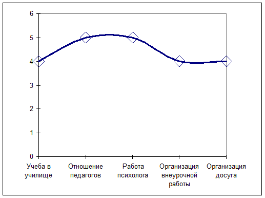 Рис. 3.3. Оценка учащимися работы педагогов и психолога Исходя из полученного опроса, мы получили, что учащиеся не представляют себя уже без училища. Они довольны проводимой с ними работой. На рисунке 3.3. представлена средняя оценка работы педагогов и психолога, исходя из которого, следует, что педагоги и психологи проводят большую работу с учащимися. В целом, по данным психологов и педагогов, работа с учащимися определенной группы на протяжении 3-х лет позволяет снизить отклонения в поведении учащихся (рис. 3.4).