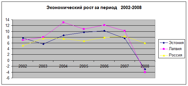 «Экономический рост, социальное неравенство и бедность в странах постсоветского режима» Введение Существует ряд стран долгое время прибывавших в тесной связи и зависимости от Советского Союза. С течением времени данный союз распался, и многие страны стали независимыми, отдельными и самостоятельными государствами, именуемыми «странами постсоветского режима». В данной работе я бы хотела провести сравнительный анализ двух стран, относящихся к вышеуказанной категории, по ряду экономических и социальных показателей. Наиболее интересными для меня оказались следующие страны: Латвия и Эстония. Причиной этого является одновременно и их близость к России, которая так же будет фигурировать в данном сравнении, и схожесть в образе жизни граждан данных государств, но в то же время отдалённость, европеизированность, иное отношение к труду и т.д. Более того, хотелось бы посмотреть по-разному ли складывается ситуация на рынке труда двух стран, какое государство более прогрессивно в отношении экономического положения своих граждан. Для сравнения рынков труда, проводится анализ каждой страны по следующим показателям: 1. Экономический рост 2. Уровень и динамика безработицы, структура безработицы, бедность населения 3. Социальное неравенство, показанное посредством уровней заработной платы. В своей работе я буду ориентироваться на данные собранные Ангусом Мэдисоном (StatisticofWorldPopulation, GDPandPerCapitaGDP, 1-2008), для анализа экономического роста стран. Более того, я буду использовать сайт Международной Организации Труда (МОТ) для анализа социального неравенства и динамики безработицы. А так же базу данных национальной организации TheWorldFactbookот ЦРУ-CIA, для подробного анализа уровня бедности в выбранных странах. В данных источниках я буду рассматривать период с 2002 года по 2008, в виду дефицита данных Международной Организации Труда по данным странам. Экономический рост. Наиболее доступными данными для анализа экономического роста стран являются базы данных, в которых содержится информация относительно ВВП на душу населения. Как мне кажется, этот показатель лучше всего характеризует экономическое состояние стран, с данным показателем возникает наименьшее количество проблем. При рассмотрении динамики ВВП Латвии, Эстонии и России стоит обратить внимание на уникальность данных стран. С одной стороны на их историю влияли одни и те же события, к примеру, распад Советского Союза оказал огромное влияние на экономику каждой страны. Но с другой стороны каждое государство – это отдельный, самостоятельный «организм», внутри которого происходят изменения, не зависящие от других стран. Более того, эти страны обладают как характеристиками страны европейского типа (разная степень для каждой страны), так и чертами советского государства. Результат соединения подобных черт - уникальные показатели для изучения. После распада Советского Союза Латвия и Эстония обрели независимость, а вместе с ней свободу выбора в отношении развития экономики. Наиболее приемлемой экономической политикой для них оказалась ориентация на другие страны, как правило, боле могущественные и расположенные по соседству. Это во многом изменило экономическую ситуацию Латвии, и Эстонии, которую я постараюсь проанализировать по данным среднедушевого ВВП с 2002 года по 2008. Ниже представлен граф