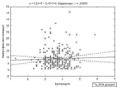 Оскільки 1,728<3,84, то гіпотеза про незалежність лімфоцитів і еритроцитів не відхиляється.