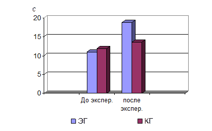 В контрольной группе до проведения эксперимента средний результат составил - 18,8 с. После проведения экспериментальной методики результат изменился, но не достоверно и составил-21,1с. Темпы прироста составили - 11 % (рис.6.).