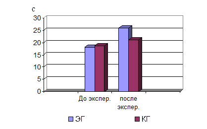 В тесте "проба Ромберга" (пяточно-носочная), отражающая уровень развития способности к сохранению равновесия, произошли статистически достоверные изменения результата. В ЭГ до педагогического эксперимента средний результат составил - 18,2 с, после проведения педагогического эксперимента - 25,9 с; темпы прироста изучаемого показателя составил - 34%.