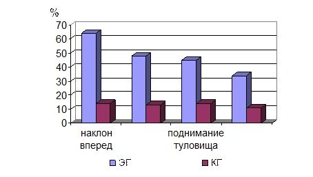 5) После проведения экспериментальной методики улучшилась показатели в тестах, отражающих уровень физических качеств ("наклон туловища вперед" - 64%; "удержание туловища" - 48%; "поднимание туловища" - 45 %; проба Ромберга "пяточно-носочная" - 34 %).