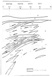 Рисунок 1. Разрез через Султановское месторождение. Отношение Cu: Zn в породах. Стрелки показывают направление возрастания Cu: Zn в породах – направление движения гидротерамальных растворов в полиметаллическую стадию (по В.Г. Прохорову). Лучше всего отвечает данным осадочная теория происхождения колчеданных месторождений [3]. Намечается не менее двух этапов рудообразования. В первый этап на сероводородном барьере на дне моря отлагались пластовые залежи пирита. Во второй – полиметаллический этап – толщи пирита служили сульфидным барьером для гидротермальных растворов, несущих медь, свинец и другие халькофильные элементы [8]. Их источником были вмещающие породы, в которых формировались зоны выщелачивания. На сульфидном барьере происходила реакция замещения: FeS2 +2Zn²+→ 2ZnS+Fe²+ FeS²+2Pb²+→2PbS+Fe²+ 9FeS2+5Cu²+→5CuFeS2+4Fe²+4S²- Возможность аналогичных реакций замещения была экспериментально доказана. Расчетным путем доказано, что изобарный потенциал ∆Z при t=200˚С отрицателен, т. е. процесс термодинамически возможен. Пиритные толщи служили также геохимическим барьером для серебра и золота; при отсутствии геохимического барьера на пути движения гидротермальных растворов руды не образуется, возникает лишь рассеянная минерализация [13]. Зона выщелачивания металлов и сульфидный (пиритный) барьер установлены и на другом изученном колчеданном месторождении. Расчеты показали, что в ходе метаморфических процессов из андезитовых порфиритов было выщелочено 720 тыс. т Cu, 114 млн. т Fe, 77,7 тыс. т Co и т. д. Интересны следующие выводы, имеющие не только теоретическое, но и практическое значение. Предполагаются, что первым основным фактором, определяющим перспективность района на нахождение гидротермальных месторождений с геохимических позиций, следует считать наличие зон гидротермальных измененных пород с пониженным по сравнению с исходными породами содержанием рудных элементов. Второй фактор – наличие геохимических барьеров, на которых могло произойти осаждение выщелоченных металлов. Третий фактор – наличие благоприятных структурно-тектонических условий, определяющих сбор и движение гидротерм к геохимическим барьерам. Обширные поля убогой минерализации являются показателем, что дальше миграция рудных элементов в растворах не шла, следовательно, породы, располагающиеся за этой зоной, бесперспективны. Одновременны можно утверждать, что если возникло обширное поле рассеянной минерализации, значит на пути движения гидотерм не было геохимических барьеров, осаждавших рудные элементы [8]. 2.2 Геохимические типы экзогенных месторождений. Экзогенные месторождения целесообразно систематизировать по типам миграции элементов. Ниже приведены четыре группы месторождений выделенные на этой основе: 1. Месторождения, формирование которых связано с механической миграцией. К ним относятся россыпи. 2. Месторождения, формирование которых связано с физико-химической миграцией. 3. Месторождения, формирование которых связано с биогенной миграций, – каустобиолиты, органогенные известняки, кремнистые породы, фосфаты и нитраты (гуано) и др. 4. Месторождения, формирование которых связано с техногенной миграцией, – искусственные месторождения солей и др. Рудные тела гидрогенных месторождений приурочены к водоносным горизонтов артезианских бассейнов, содержащих пласто