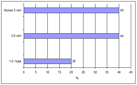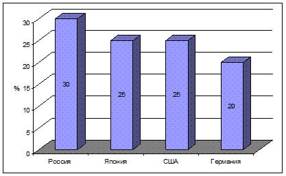 Рис. 2.3. Предпочтения респондентов в частоте времени смены автомобиля Равное количество предпочтений отдали респонденты при смене в период от 3-5 лет и более 5 лет (по 40%). Самое меньшее значение получила категория от 1-2 года (20%). Скорее всего, это вызвано желанием не спешить с продажей собственного авто и накоплением более крупной суммы денег для приобретения другого авто. Также, имеет важность страна производящая автомобили. Так, большинство опрошенных хотят приобрести отечетсванный автомобиль 30%, японский и американский по 25% из опрашиваемых и меньше всего пожелали купить автомобиль производства Германии 20%. Графическое представление предпочтений потенциальных покупателей в зависимости от страны-производителя автомобиля, изображено на рис. 2.4.