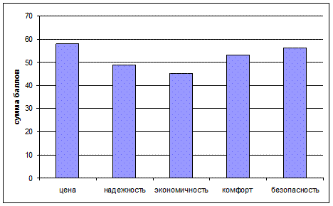 Рис 2.10 Приоритетный показатели при выборе автомобиля Как видно и анализа графика наибольшее количество баллов получили цена и качество, это вероятно объясняется тем, что респонденты учитывают при не только как правило цену автомобиля, но и безопасность при этой же цене автомобиля, заботясь прежде всего о своих жизнях.