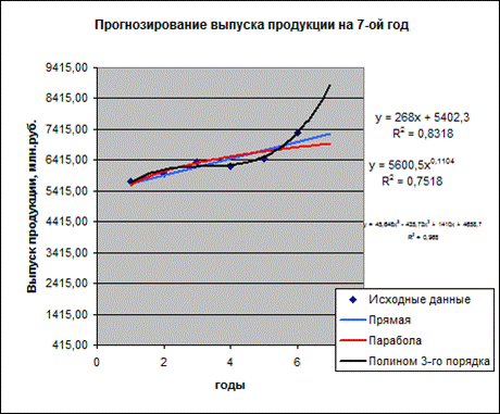 Прогнозируемый объем реализации продукции на 7 год (по данным шестилетнего периода) с использованием среднего абсолютного прироста и среднего темпа роста, рассчитанных в Задании 1, приведены в табл.3.4. Вывод. Как показывают полученные прогнозные данные, прогнозируемые объемы реализации продукции на 7 год (по данным шестилетнего периода) довольно близки (значительно отличаются) между собой: ………… и ……………млн.руб. Расхождение полученных данных объясняется тем, что в основу прогнозирования положены разные методики экстраполяции рядов динамики. Задача 2. Прогнозирование выпуска продукции предприятием на год вперёд методом аналитического выравнивания ряда динамики по прямой, полиному 2-го порядка (параболе) и степенной функции выполненос использованием средств инструмента МАСТЕР ДИАГРАММ и представлено на рис. 3.1.