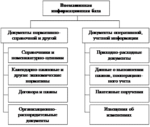 Рисунок 1- Внемашинное информационное обеспечение ИБ объединяет собственно информацию внемашинной сферы предметной области, а средства ее организации и ведения предназначены для обеспечения работы с ней. Внемашинную информационную базу образуют данные, содержащиеся в документах. Внемашинная информационная база включает нормативно-справочную, плановую (то есть условно-постоянную) информацию и оперативную (учетную) информацию некоторой предметной области. Примерный типовой состав информации одного и другого вида представлен на рисунок 2. Решения по информационной базе предполагают определение состава информации, необходимой для решения задач пользователя. Кроме того, должна быть выявлена логическая структура информации, что позволяет перейти к этапу формализации и моделирования данных, необходимому для автоматизированной обработки. Структурирование информации внемашинной сферы находит отражение в ее представлении отдельными структурными единицами, их группировкой в документах, упорядочении по классификационным признакам.