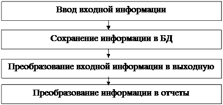 Рисунок 11 - Схема базы данных, созданной средствами MSAccess. 1.2.1 Формализация расчетов (алгоритмы расчета и решения задач) Для получения выходной документации, входные данные преобразовываются по определенному алгоритму. Алгоритм выполнения обработки данных в ИС «Отдел кадров» представлен на рисунке 12. В соответствии с рисунком приводятся краткие описания каждого этапа выполнения работ. 1 Ввод входной информации На данном этапе производится ввод информации ; 2Сохранение информации в базу данных. 3 Преобразование входной информации в выходную. 4 Преобразование информации в отчеты. Выходная информация преобразуется в отчеты для удобного просмотра и вывода на печать.