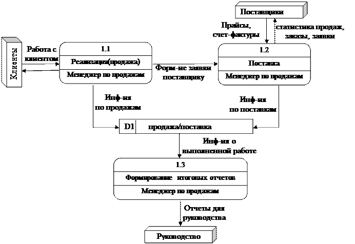 Рисунок 13б - DFD-диаграмма подсистемы «Менеджер по продажам» Пояснение: «Работа с клиентом» - консультирование по нужному а/м, предоставление договоров на продажу; Со стороны клиента: предоставление нужных документов 3 ПРОГРАММНОЕ ОБЕСПЕЧЕНИЕ КОМПЛЕКСА ЗАДАЧ Программное обеспечение комплекса задач было выполнено в среде программирования Delphi 7.0. Выбор среды обусловлен широкими возможностями данного языка программирования по созданию приложений рассчитанных на работу с электронными архивами (базами данных). В виду компактных размеров и узкого круга решаемых задач проект на данной стадии проектирования лишен инсталляционного пакета, в связи с чем, распространение программного продукта производится методом прямого копирования. Для успешной эксплуатации информационной системы необходимо выполнение ряда аппаратных и программных требований: - процессоркласса Pentium, Celeron, Athlon, Duron; - 32 мегабайта оперативной памяти; - операционная система Windows 98/Millennium/NT/2000/XP; - монитор с разрешением экрана 800x600; - матричный, струйный или лазерный принтер; - объем свободной памяти на диске около 6 Мб. 3.1 Общие положения Программа «Магазин» выполнена по технологии базирующей свои услуги на Windows NT - системах, с доступом к MSAccess. Доступ к базам осуществляется при помощи специальных элементов AdoTable и AdoQuery. Эти компоненты работают через интерфейс ODBC. MicrosoftAccess, в настоящее время является одной из самых популярных СУБД. Среди причин такой популярности следует отметить: - высокую степень универсальности и продуманности интерфейса, который рассчитан на работу с пользователями самой различной квалификации. В частности, реализована система управления объектами базы данных, позволяющая гибко и оперативно переходить из режима конструирования в режим их непосредственной эксплуатации; - глубоко развитые возможности интеграции с другими программными продуктами, входящими в состав MicrosoftOffice; Нельзя не отметить, что, существенной причиной такого широкого распространения MSAccess является и мощная рекламная поддержка, осуществляемая фирмой Microsoft. 3.2 Структурная схема пакета (дерево вызова процедур и программ) Для наглядности представления работы разрабатываемого приложения необходимо построение его структурной схемы, которая содержит общий алгоритм переходов между формами проекта. На рисунке 14 представлена структурная схема приложения. Главная форма состоит из ряда кнопок, которые в свою очередь связаны с базой по определенному алгоритму.