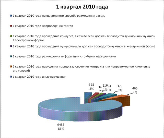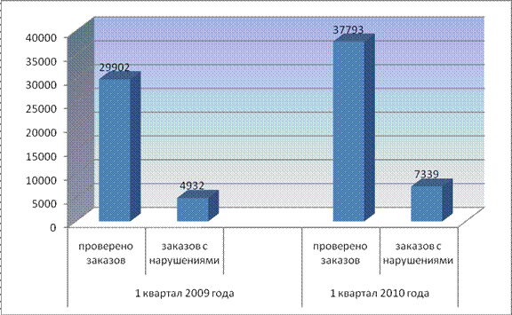 Из приведённых показателей усматривается положительная тенденция к увеличению процента удовлетворённых обращений о согласовании к общему числу обращений, рассмотренных органами ФАС России. Это обстоятельство свидетельствует об увеличении в общей массе размещаемых государственных заказов доли заказов, размещённых без нарушений. Из анализа обращений государственных заказчиков о согласовании возможности заключения государственного контракта с единственным поставщиком (исполнителем, подрядчиком) следует, что решение об отказе в согласовании возможности заключения государственных и муниципальных контрактов с единственным поставщиком (исполнителем, подрядчиком) принимается в основном по следующим причинам: - отсутствие обоснования того, что поставщик (исполнитель, подрядчик) соответствует требованиям Закона о размещении заказов и конкурсной документации (документации об аукционе); - согласуемая цена контракта превышает начальную (максимальную) цену контракта, установленную в извещении о проведении конкурса (аукциона); - отсутствие в представленных документах согласия предполагаемого поставщика (исполнителя, подрядчика) на заключение государственного или муниципального контракта на условиях конкурсной документации (документации об аукционе); - несоответствие конкурсной документации (документации об аукционе) требованиям Закона о размещении заказов; - установлены неправомерные требования к участникам размещения заказа в конкурсной документации (документации об аукционе); - заказчиком не представлены сведения о повторном размещении заказа путём запроса котировок. В течение I квартала 2010 года органами ФАС России рассмотрено 3178 уведомления о размещении заказа у единственного поставщика (исполнителя, подрядчика). В 259 (8%) случаях заказы размещены с нарушением Закона о размещении заказов. В I квартале 2010 года Комиссией ФАС России по контролю в сфере размещения заказов путем проведения закрытых торгов и аукционов рассмотрено 2 обращения о согласовании размещении заказа путем проведения закрытого конкурса (закрытого аукциона). По результатам рассмотрения 1 обращения удовлетворено, второе возвращено по формальным основаниям. Резкое снижение обращений о согласовании проведения закрытых торгов обусловлено передачей Федеральной службе по оборонному заказу полномочий по согласованию проведения закрытых торгов на поставки товаров, выполнение работ, оказание услуг для федеральных государственных нужд, не относящихся к государственному оборонному заказу, сведения о которых составляют государственную тайну (Указ Президента РФ от 12.02.2008 № 187 «О внесении изменений в Положение о Федеральной службе по оборонному заказу, утвержденное Указом Президента Российской Федерации от 21 января 2005 г. № 56С». Осуществление контроля соблюдения законодательства при размещении заказов путём проведения проверок. В соответствии с положениями статьи 17 Закона о размещении заказов контроль за соблюдением государственными и муниципальными заказчиками требований законодательства Российской Федерации о размещении заказов осуществляется путем проведения плановых и внеплановых проверок. В течение I квартала 2010 года органами Федеральной антимонопольной службы России проведено: - 131 плановые проверки; - 2294 внеплановая проверка р