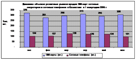 Объем Казахстанского рынка – 400 MUSD. Доля Казахстана в объемах продаж сотовых телефонов в Средней Азии в 2006 году составит около 55%. [1]