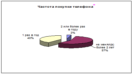 Частота покупки сотового телефона Проанализируем, как часто потребители меняют телефон. Согласно опросу, проведенному мной большинство потребителей (57%) не меняют телефон более двух лет. 40% опрошенных покупают новый сотовый один раз в год. И Самые активные потребители, т.е. те, кто обновляет телефон более или 2 раза год составили 3%. В данном опросе участвовали жители Алматы. С доходом выше 500 $ в месяц. Средний возраст 30 лет. Диаграмма 2 Частота покупки сотового телефона