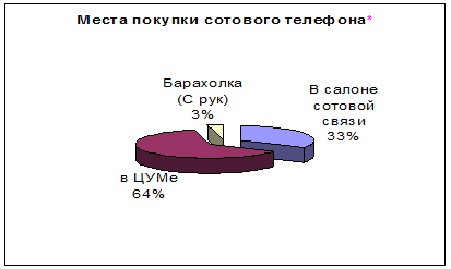 Места покупки Борьба с «серыми» телефонами который год ведется в нашей стране с переменным успехом. И у нас уже в подсознании укоренилось, что серые телефоны – это плохо. Так оно и есть. Потому, что государство с каждого проданного «серого» телефона не дополучает налогов, раз. Сервис – центры ремонтируют бесплатно по гарантийным обязательствам те аппараты, которые официально предназначены для продажи в Казахстане, два. В противном случае, телефон будет отремонтирован платно. Следует учесть, что аппараты могут иметь так называемый SIM – lock (ограничение по использованию только одного типа SIM – карты), три. Аппараты, которые не предназначены для нашего рынка, могут иметь некоторые особенности в меню (наличие или отсутствие некоторых функций), четыре. Вот и вся разница между «белыми» и «серыми» телефонами. Так что, если уровень жизни потребителя близок к среднестатистическому, и заплатить деньги за новый телефон не равнозначно тому, что заплатить за пачку сигарет, то лучше купить сертифицированное оборудование в Салоне Сотовой Связи или в специализированном отделе магазина. Чуть дороже, но зато надежнее. Дешево, как правило, на рынках . Заявления ряда крупных компаний в рекламе, будто у них самые низкие цены, поскольку они самостоятельно завозят телефоны – фикция. На сегодняшний день, у нас в стране нет дистрибьютора, который бы ввозил в страну телефоны только под потребности своей розничной сети. Любой дистрибьютор от 75% до 95% ввозимых им телефонов перепродает другим дилерам по оптовым ценам, которые в любом случаем много ниже цен в его розничной сети. А значит, любой дилер может теоретически установить такие же розничные цены как у дистрибьютора или даже ниже. Уровень наценки в значительно большей степени определяется накладными расходами сети магазинов (как-то аренда, зарплата, % по кредитам и прочее) и приемлемой для продавца нормы прибыли. Есть только одно исключение из этого: рекламные акции. Когда предлагаются акции: «Семь телефонов ниже $100» или «Топ – модели доступны!», чаще всего у них эти модели телефонов действительно дешевле, но, как правило, только эти (хотя стоит проверить данное утверждение самому). Цена на остальные модели, как правило, компенсирует то, что недополучили по «рекламной» акции. Недорого также стоят телефоны в Интернет – магазинах . Минус: выбор «по картинке», эргономику можно оценить только по чужим впечатлениям. Ну и важный момент «правильный выбор» Интернет – магазина, чтобы при этом не заполучить все минусы рынка. Касательно Алматы, основные точки покупки сотового телефона представлены ниже. Самым популярным местом является ЦУМ (64%). Это объясняется удобным расположением, большим ассортиментом. Диаграмма 2. Места покупки сотовых телефонов