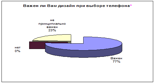 Технические характеристики и дизайн Когда мобильные телефоны только появились, ни о каком дизайне трубки не было и речи. Это в прямом смысле слова были большие прямоугольные кирпичи с длинными антеннами. Но прогресс, как известно, не стоит на месте – прошло всего несколько лет и рынок наводнили сотовые телефоны невиданных форм и конструкций. Теперь у потребителя стала болеть голова не о том, сколько весит телефон, а о том, какой бы формы выбрать себе трубку. Если рассматривать дизайн, то согласно опросу. 77% респондентов учитывают внешние характеристики при выборе сотового телефона. Т.е дизайн телефона, цвет. Форм фактор Т.е моноблоки, раскладушки, слайдер и т.д. Диаграмма 3